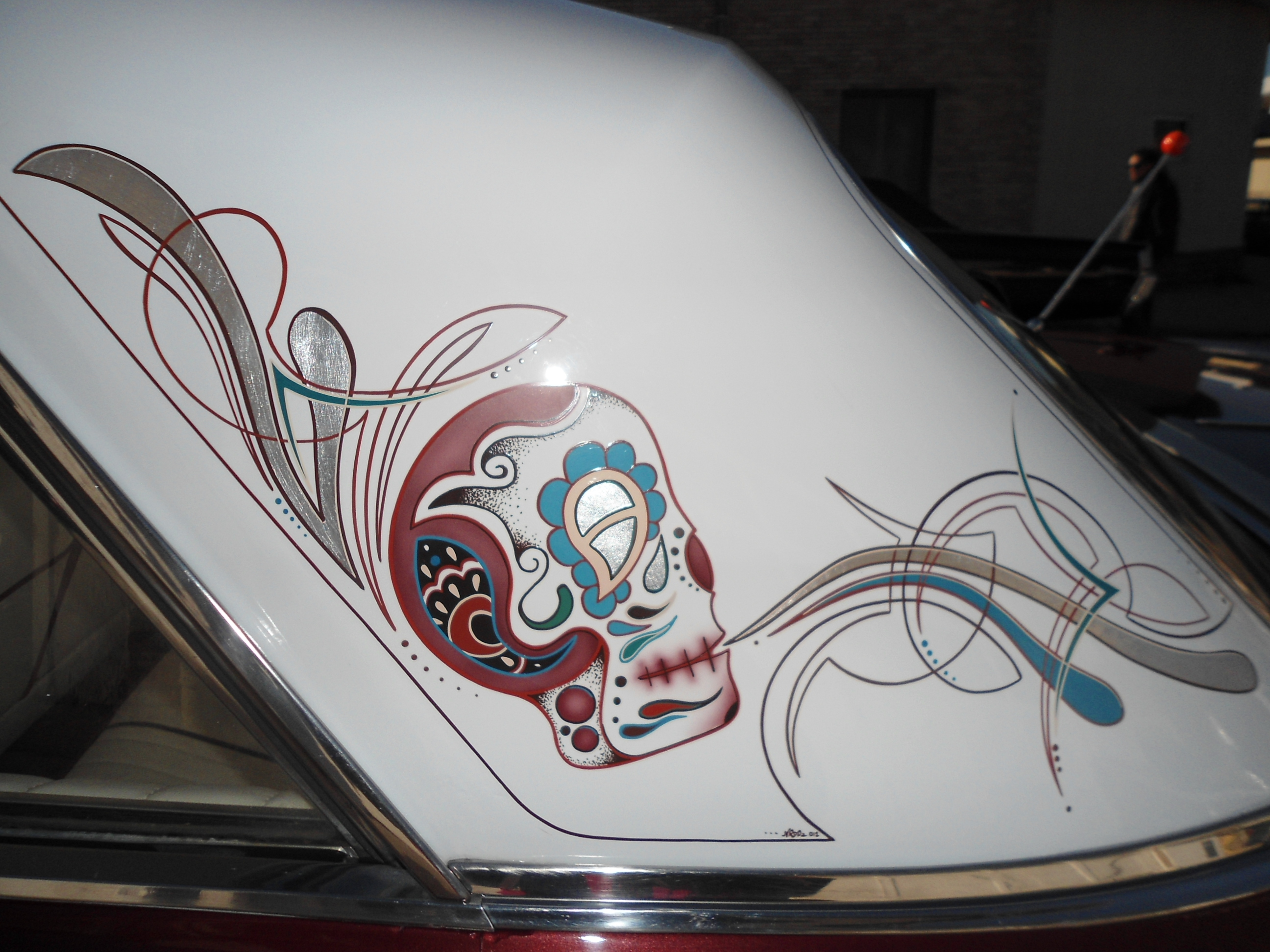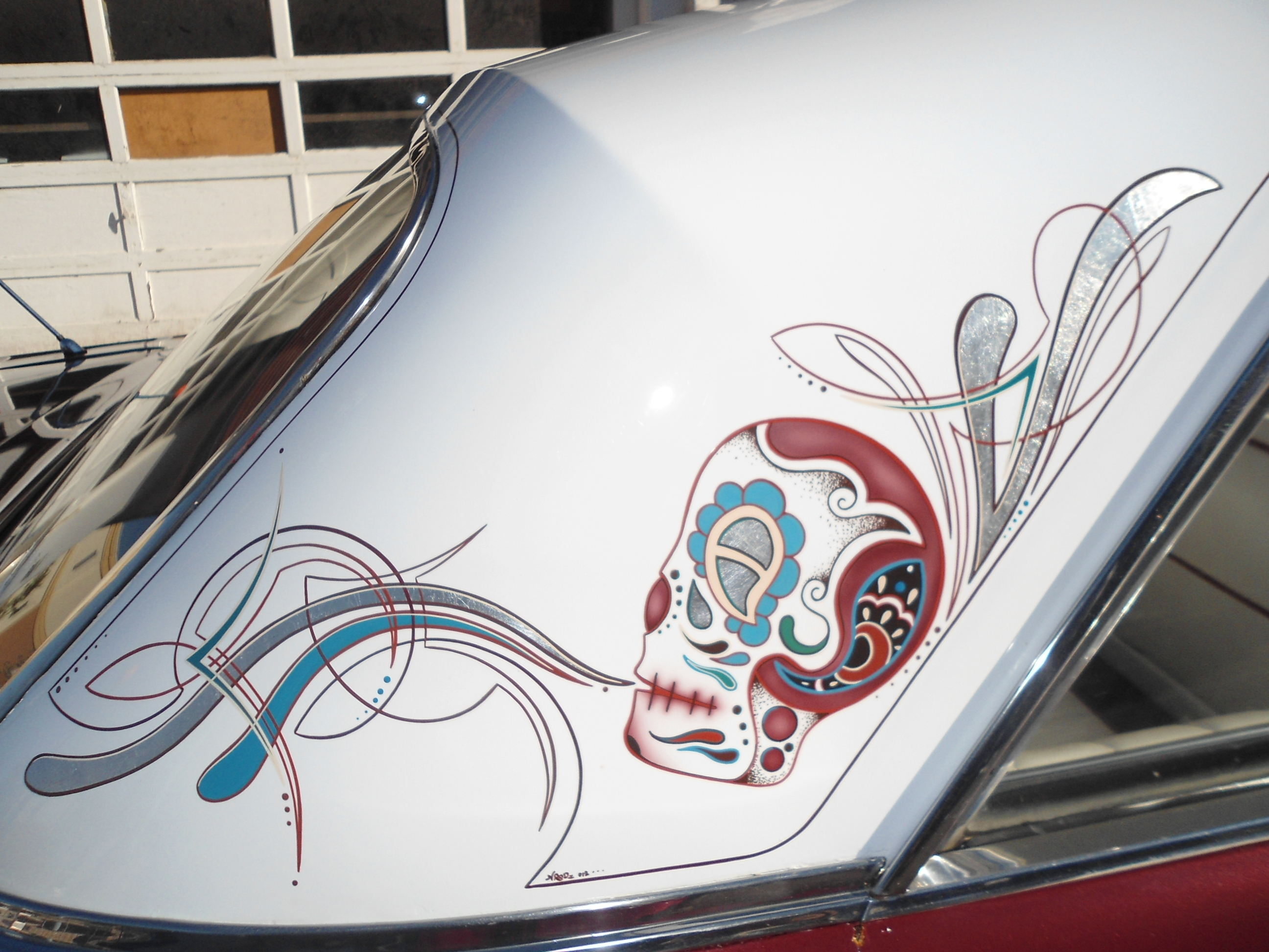 Gilding, Lowriders 2012 Date: February 3, 2014Author: nrodzoriginals 0 Comments Dia de los Muertos skulls, silver leafing and pinstriping I painted on a 64 Impala roof in 2012 Share this: Click to share on X (Opens in new window) X Click to share on Facebook (Opens in new window) Facebook Click to share on Pinterest (Opens in new window) Pinterest Like Loading... Related