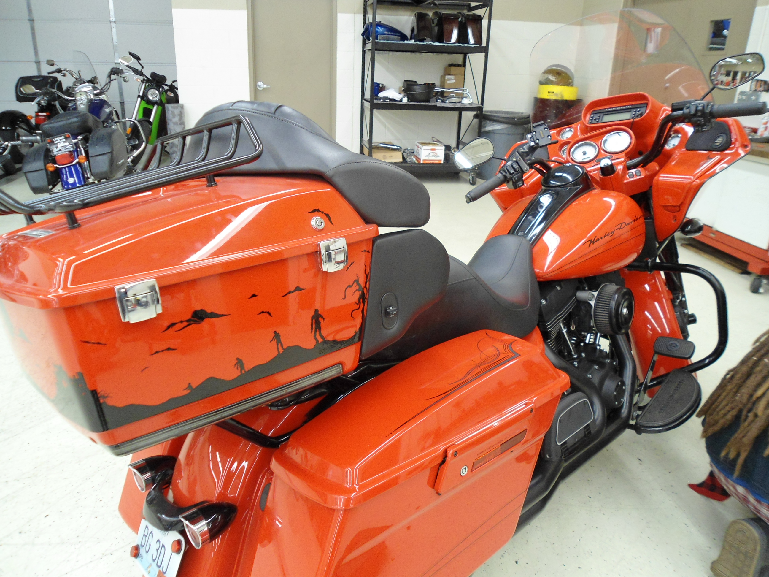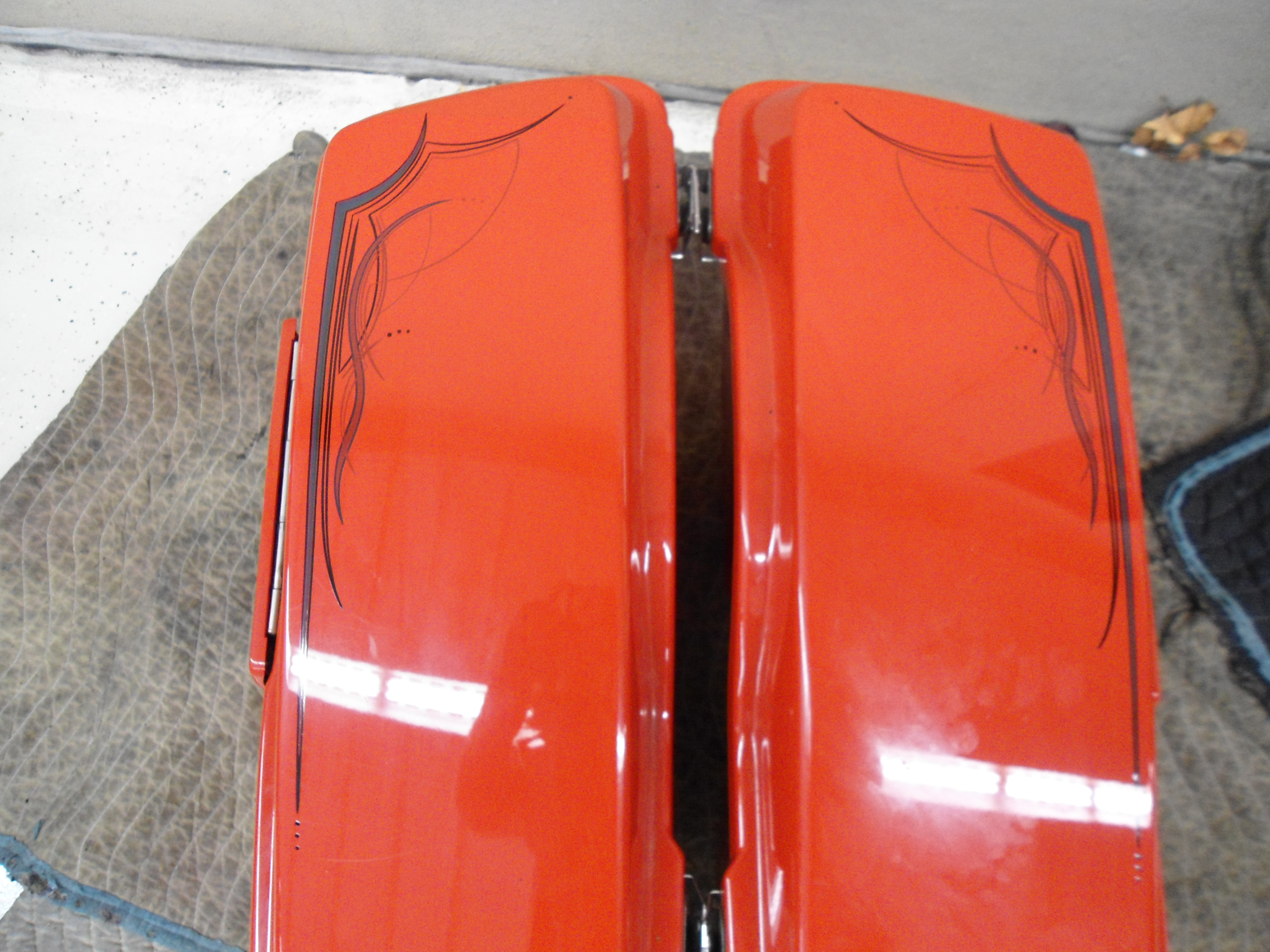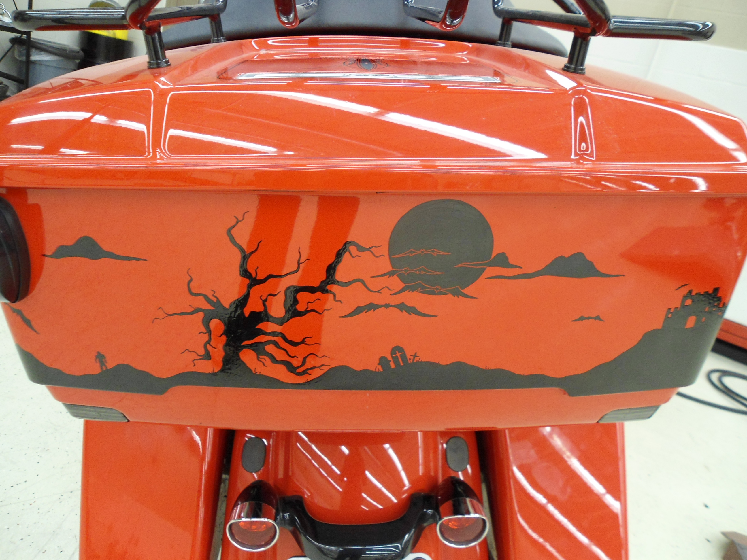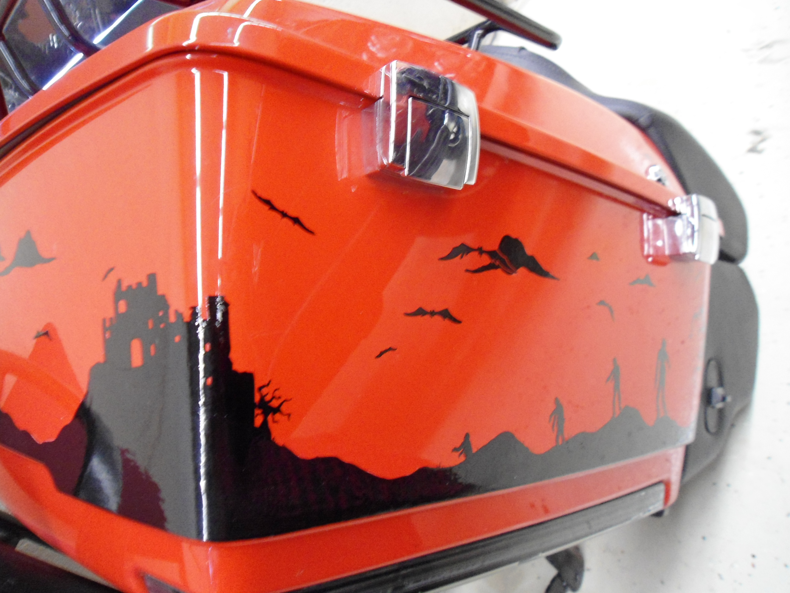Harley-Davidson I did a bit of Pinstriping on back in 2012. The stock lines also pretty much matched the bike, so I did a black line close to them, and went over the Harley emblem with black. He let me put a skull on the front and wanted more, so we did some bats and the scary silhouette scene on the back bag.