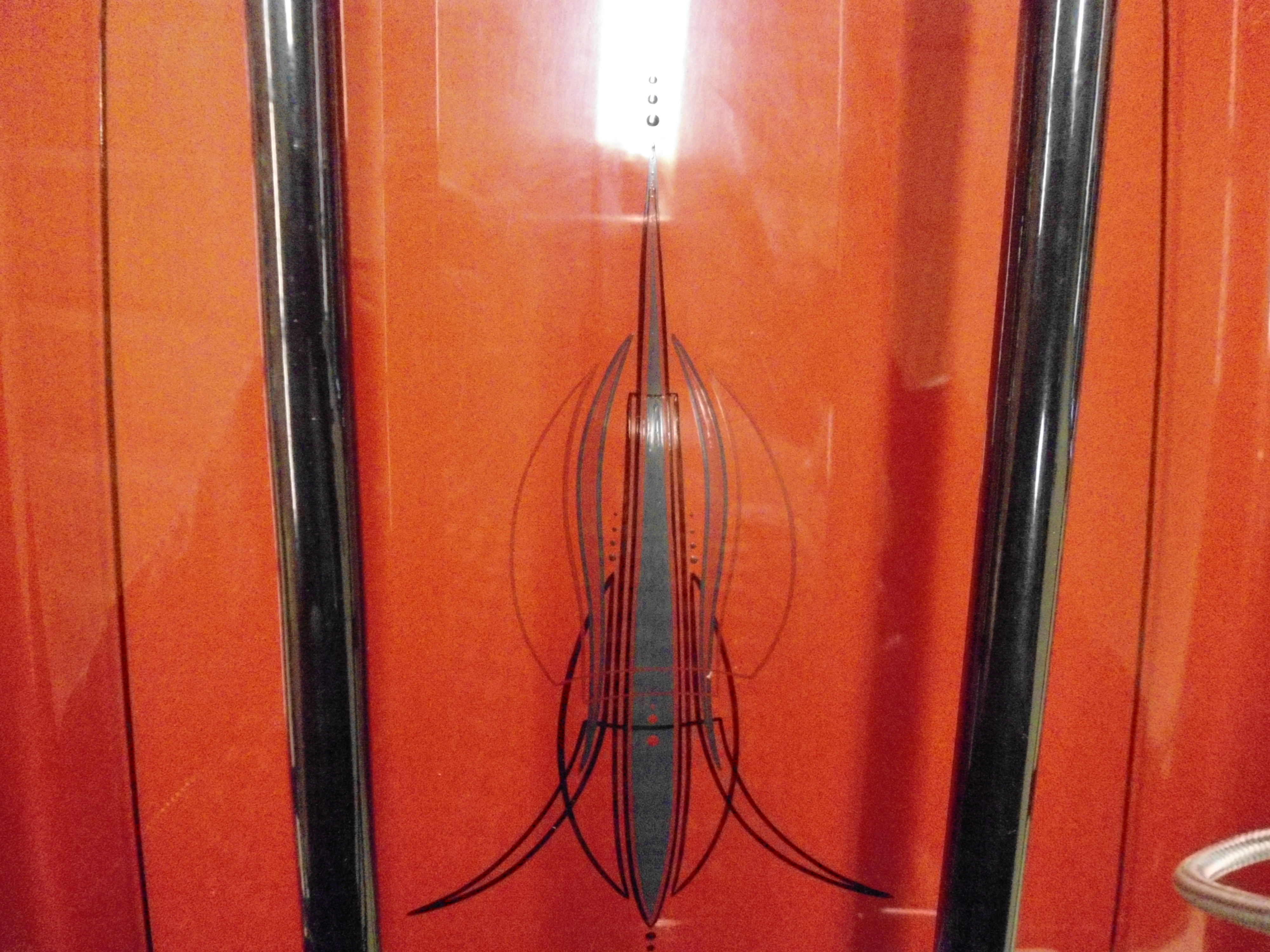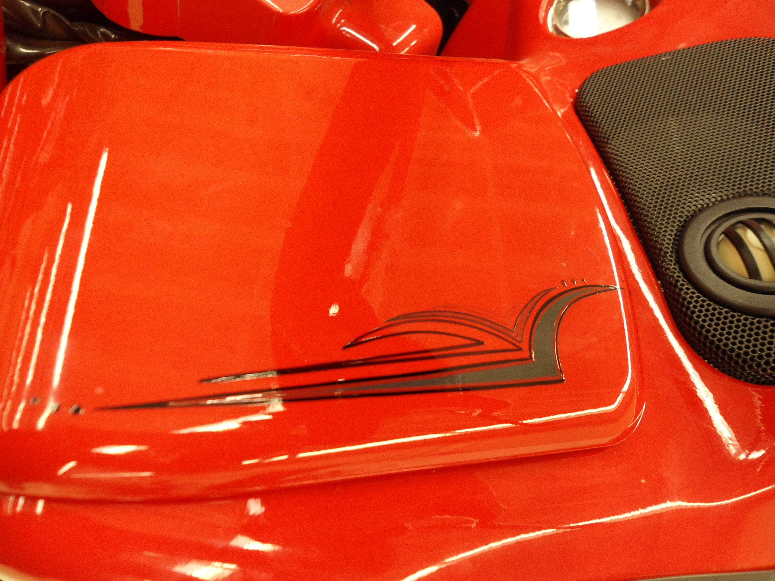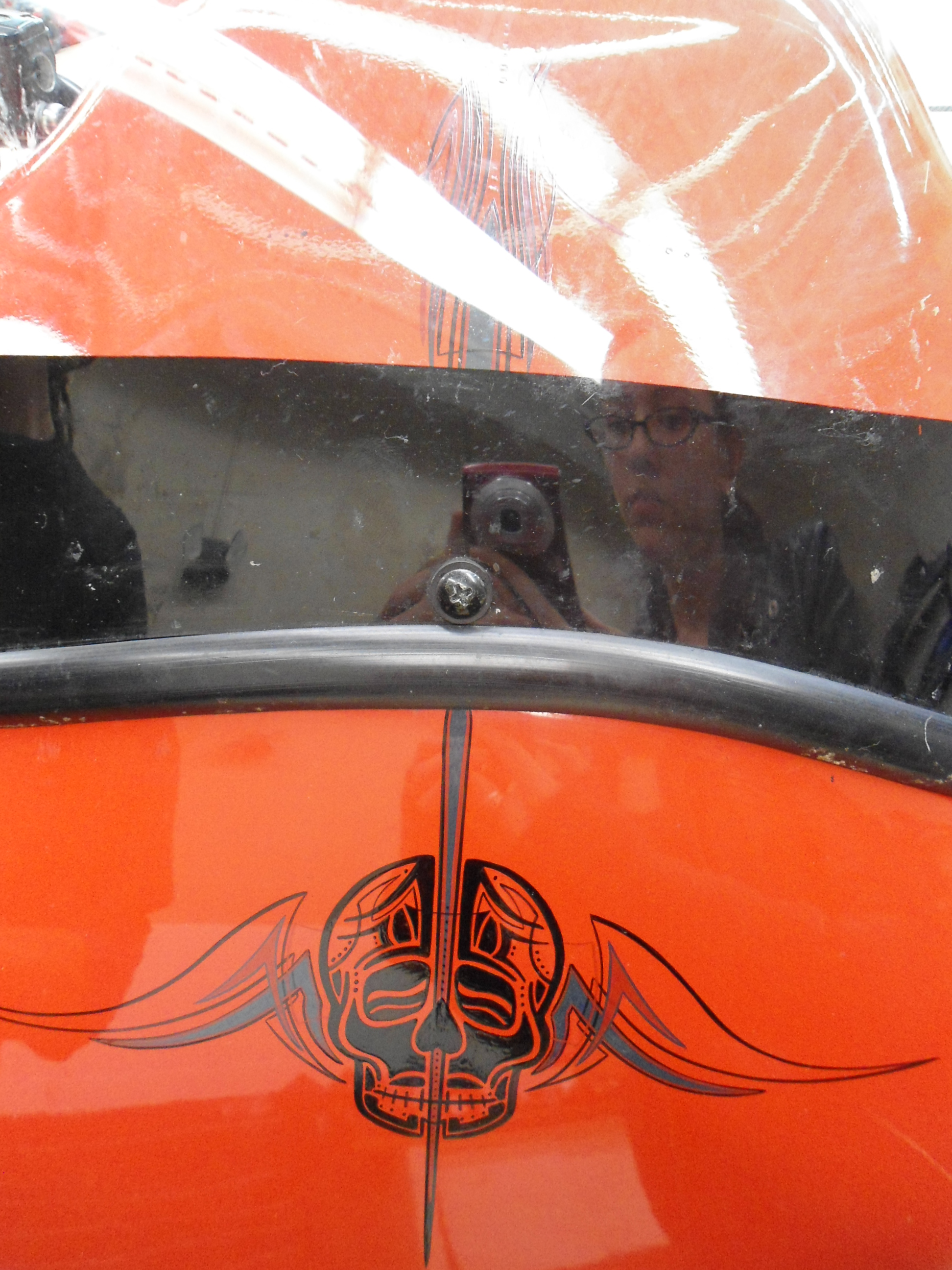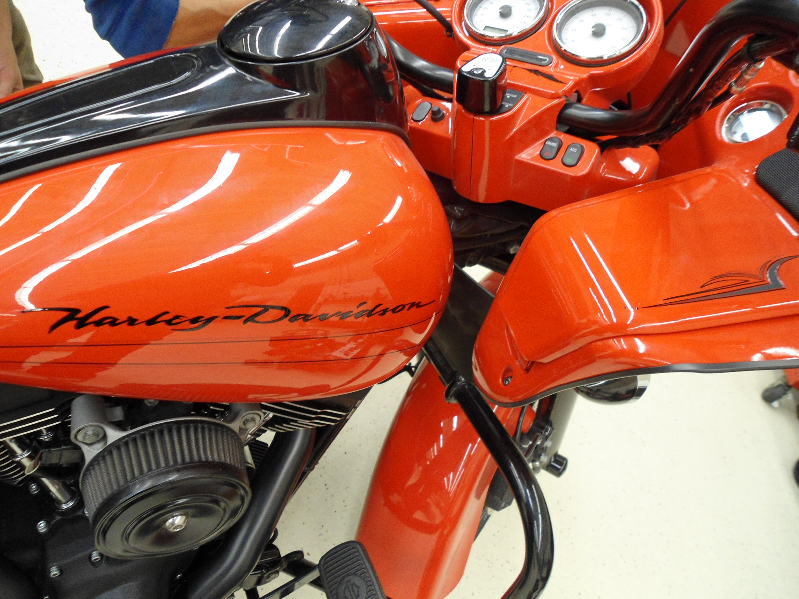 Harley-Davidson I did a bit of Pinstriping on back in 2012. The stock lines also pretty much matched the bike, so I did a black line close to them, and went over the Harley emblem with black. He let me put a skull on the front and wanted more, so we did some bats and the scary silhouette scene on the back bag.